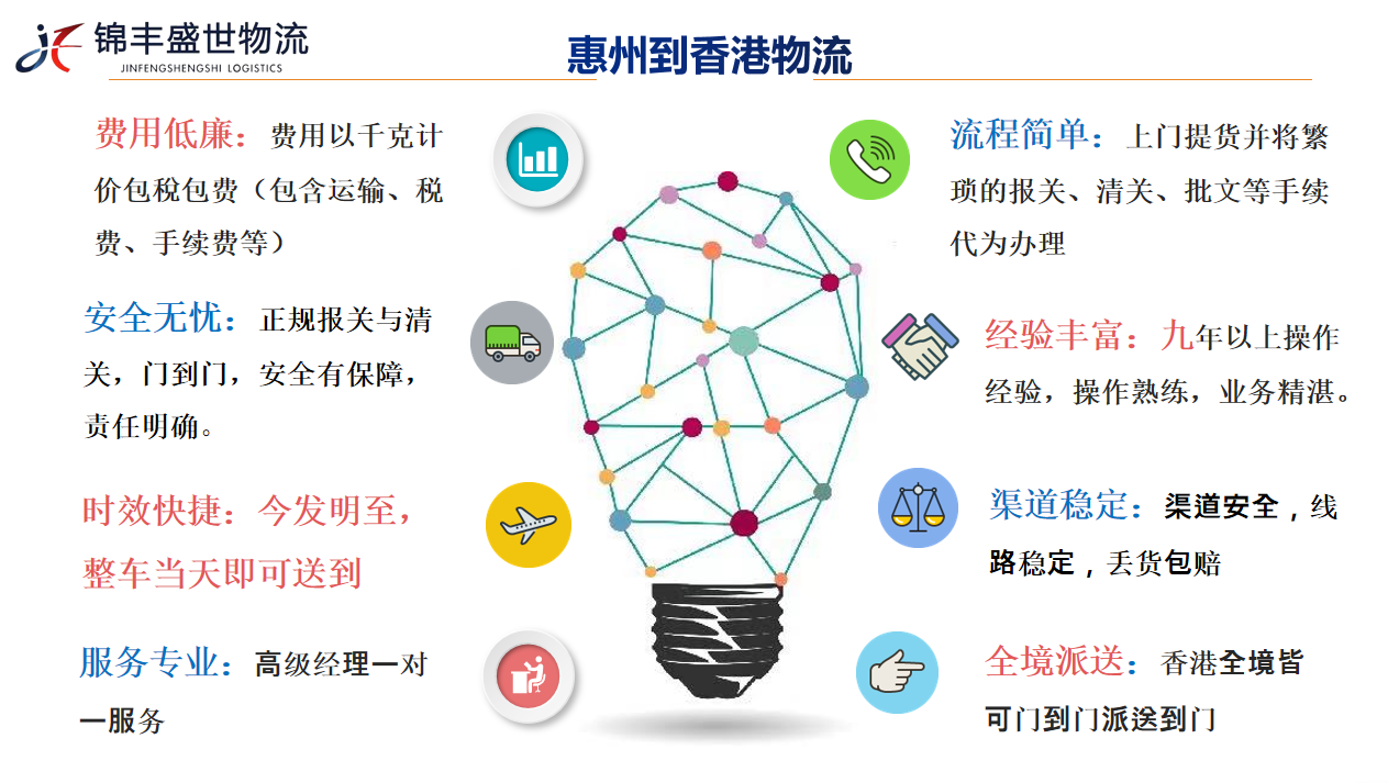 深圳市錦豐盛世物流有限公司致力于打造國內(nèi)高效、快捷、安全的香港物流服務(wù)專線。主打惠州到香港物流專線,惠州到香港整車及零擔運輸,惠州到香港快件運輸,惠州到香港一般貿(mào)易出口運輸,代理報關(guān),商檢,清關(guān)及香港全境派送服務(wù)。