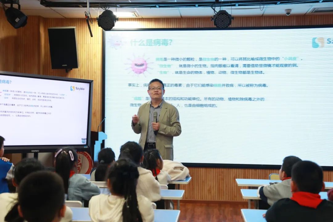 華權(quán)高以病毒的起源為切入點(diǎn),用幽默風(fēng)趣的語言、生動形象的方式,從什么是病毒、身邊有哪些常見病毒、為什么要檢測病毒、怎么檢測病毒、生活中如何預(yù)防病毒感染、科學(xué)家在病毒檢測中做了哪些貢獻(xiàn)六個方面,為同學(xué)們講解了病毒相關(guān)知識。